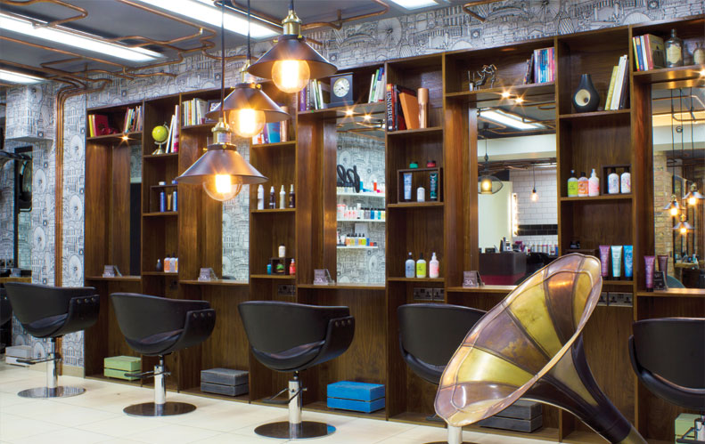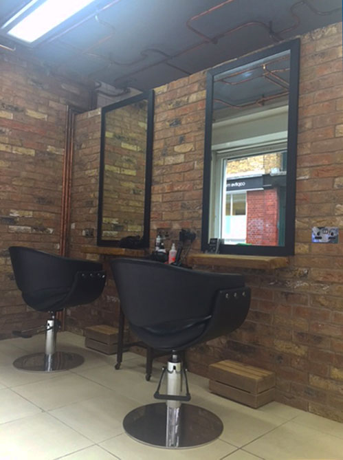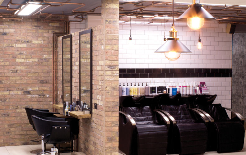 | Commercial Project London EC2 - redsign and invigorate a Hoxton hair salon to attract passing trade An extensive copper pipe sculpture was designed and installed on the ceiling to reinvigorate the low, concrete surface. The copper continues vertically down the walls to become part of the industrial fabric of the space, which is further exposed by the raw brick slips tiled onto a new partition wall. Creative pendant lighting, bespoke furniture and varied textures were used to break the space up into more discreet areas for creative hairdressing. |