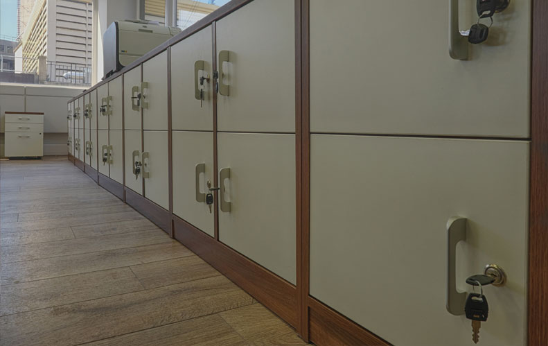 | Main Office | Personal Lockers | Meeting Room | Work/Coffee Bar |