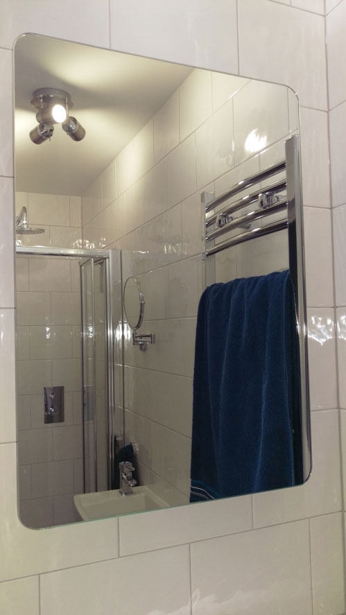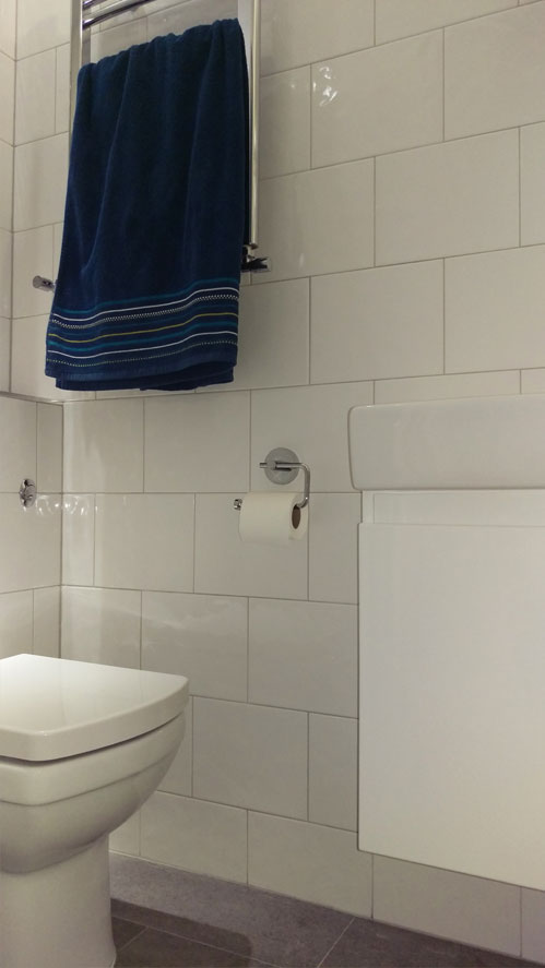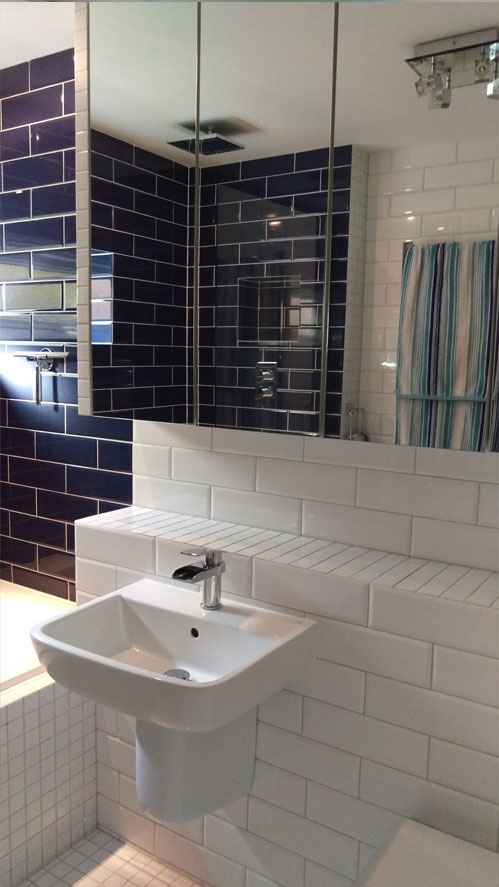 | Residential Project London SW19 - mirrors, lights, and reflective surfaces were employed to exaggerate the sense of space. The ground floor cloakroom has been extended to accommodate a shower enclosure. The space is compact at less than one meter wide but, perfectly proportioned. Despite its size, it has an airy feel achieved by lighting, bumpy gloss white wall tiles, a generously sized mirror and polished chrome fittings. A high-powered HIB Cyclone extractor has been installed to adequately deal with condensation in the window-less space. |